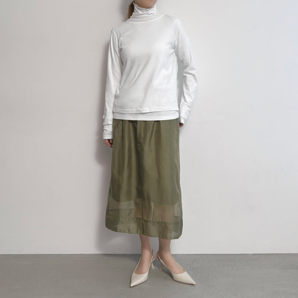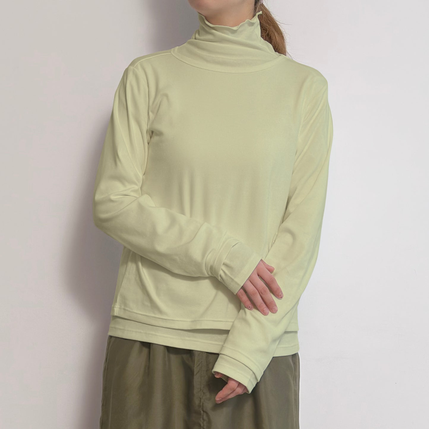ハイネックはメロウ仕上げの首元がポイントで、インナーにも使いやすいデザイン。