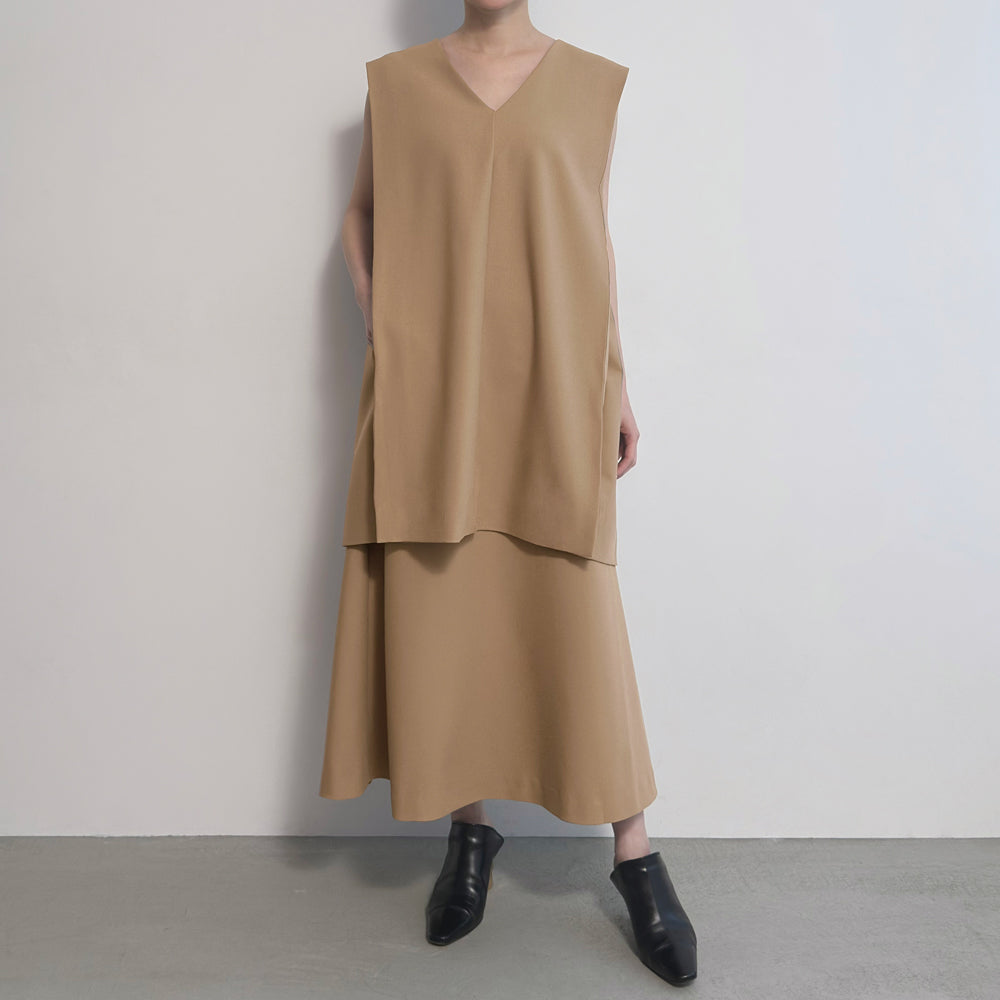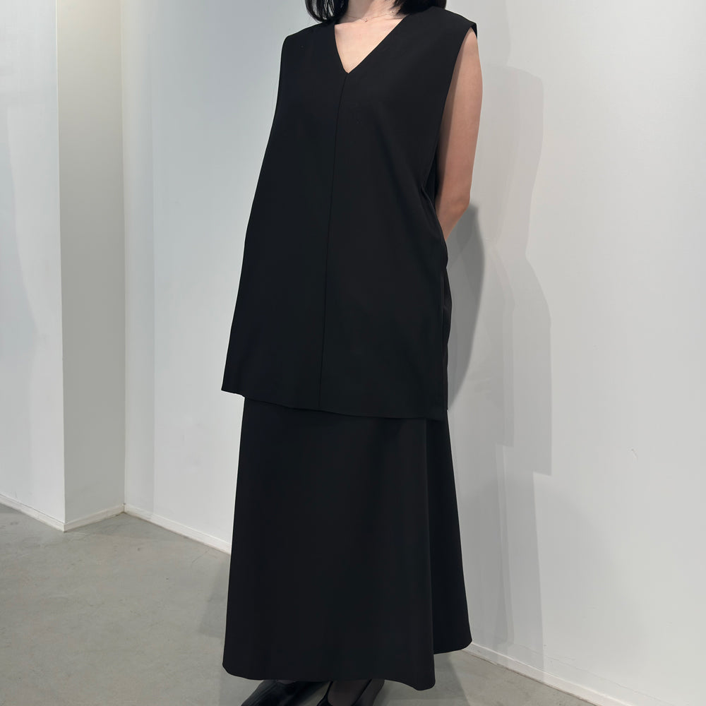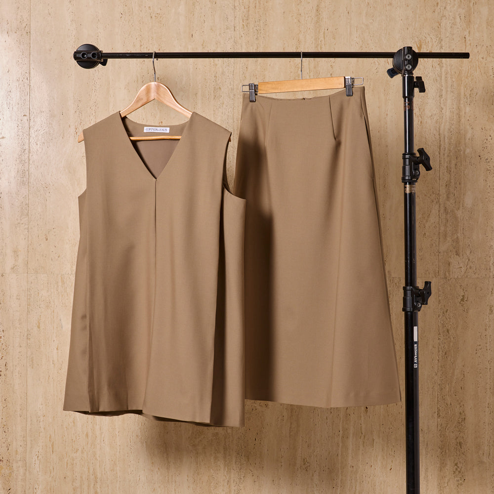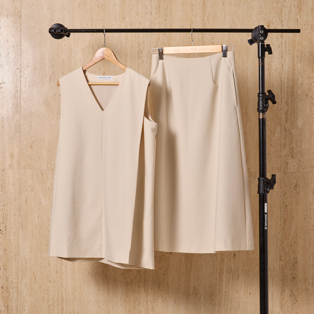Iラインのベストとスカートを組み合わせたセットアップは、体のラインを無理に強調せず、自然にすっきりとした印象へ導いてくれる一着です。落ち感のある素材が縦の流れを美しく引き立て、シンプルでありながら、どこか洗練された佇まいに。