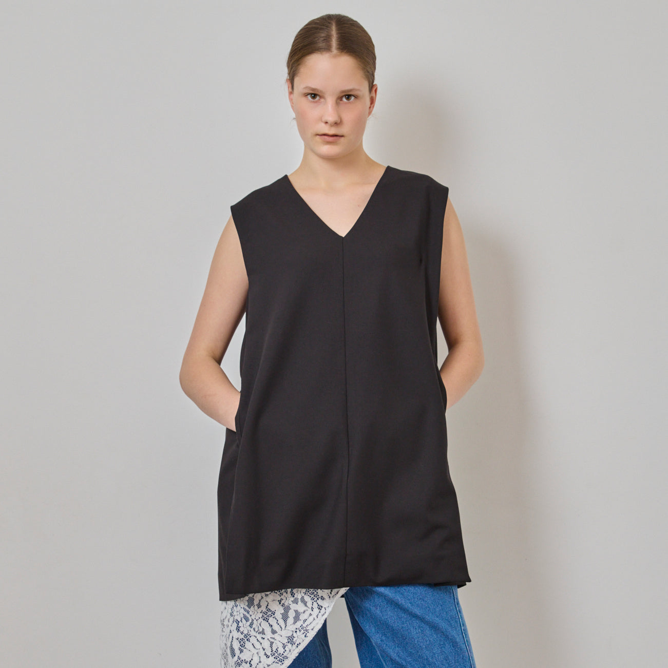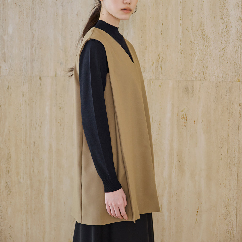 ベストはヒップが隠れる丈感で、体のラインをさりげなくカバー。切り替えパターンにこだわることで立体感のあるフォルムをつくり、セットアップとしてはもちろん、単体でチュニックのように着ることもできます。シャツやニットに重ねることで、印象を変えながら着回せるのも魅力。両サイドにポケットを備え、実用性にも配慮しました。